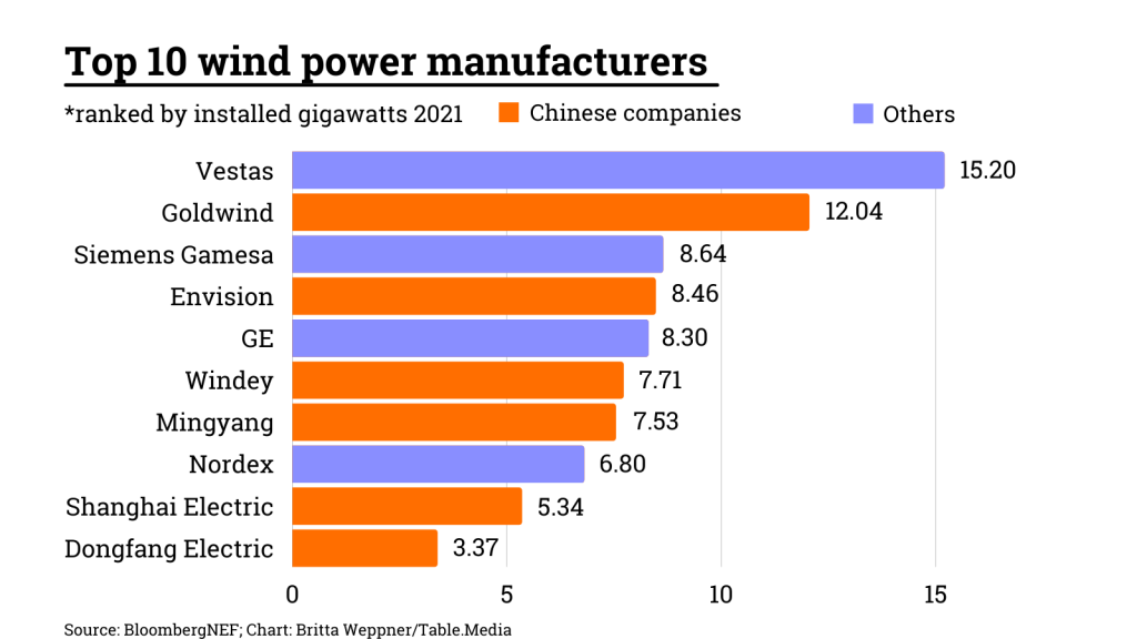 Will wind turbine manufacturing relocate from Europe to China? That is unlikely. After all, the wind industry is very different from the solar industry. Solar module manufacturers manufacture a mass product that can easily be transported halfway around the globe. The wind industry is much more complex. Turbines include up to 8,000 components, writes Ilaria Mazzocco. “Wind turbine manufacturers are usually also directly involved in maintenance and installation,” says the China energy expert from the Center for Strategic & International Studies. Turbine manufacturers often maintain a local presence.