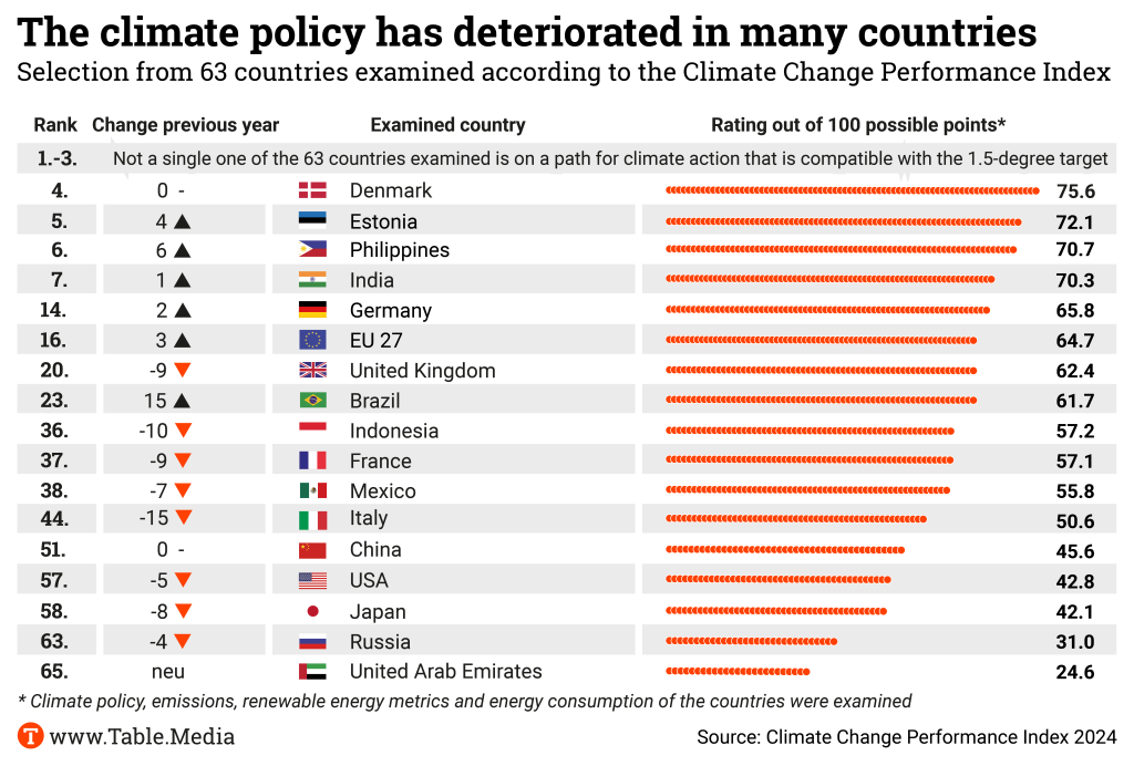 Climate policies have deteriorated in many countries, and the world is making little progress toward the Paris Climate Agreement goals. This is the conclusion of the new “Climate Change Performance Index 2024” by Germanwatch and the New Climate Institute. None of the 63 countries examined is on a path compatible with the 1.5-degree target. In the climate policy sub-rating, not a single country scores “good” for the first time. The index assessed the climate policy, emissions, renewable energy metrics, and energy consumption of the countries.