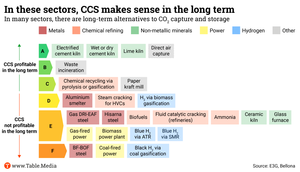 The British think tank E3G has developed a “CCS ladder” to show in which sectors the use of CCS would make the most sense and which sectors have more cost-effective alternatives. According to E3G, the use of CCS in gas-fired power plants, which the British government wants to support, is more of a “financial burden for the emitter”. The use of CCS in hydrogen production is also viewed critically. Doug Parr, political director of Greenpeace UK, criticizes: “Hydrogen from natural gas is not low-carbon and there is a danger that we are committing ourselves to second-rate solutions.”