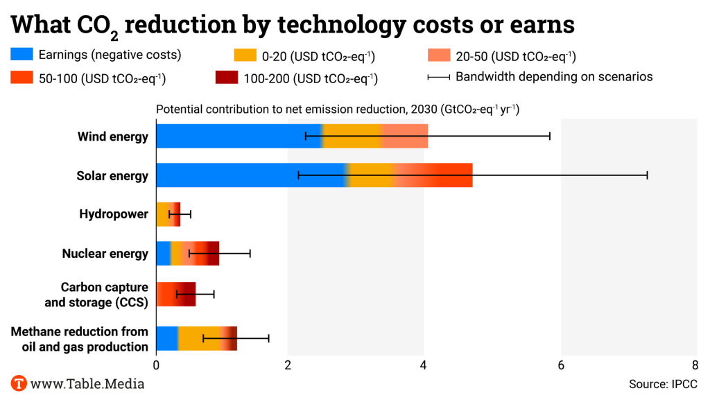 Andreas Löschel, Professor of Resource Economics at the University of Bochum and one of the lead authors of the energy chapter in the IPCC report, told Table.Briefings: “You can’t see a renaissance of nuclear power from the IPCC report.” Nuclear power’s current share of global electricity generation of around nine percent will remain roughly the same due to the massive increase in electricity demand, even if capacities are doubled, as predicted by the IAEA. “Nuclear power will continue to play its role. But it is not a game changer on the way to net zero by 2050.”