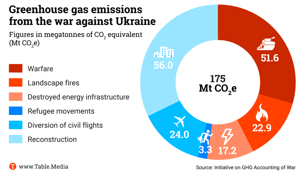 Between February 24, 2022, and February 24, 2024, Russia’s war of aggression against Ukraine generated 175 million tons of CO2. These emissions are equivalent to the annual use of 90 million cars. This figure is one of the most important findings of the study “Climate Damage Caused by Russia’s War.” Its main author, climate researcher Lennard de Klerk from the Warbon Initiative on GHG Accounting of War, presented it in mid-June on the fringes of the Ukraine Recovery Conference (UCR) in Berlin.
