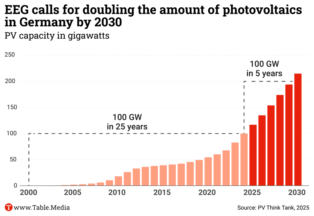 Germany currently has around 100 gigawatts of photovoltaic capacity installed, which is set to more than double to 215 GW over the next five years according to the expansion targets of the German Renewable Energy Sources Act (EEG). In 2024, the expansion of solar energy was well above the expansion path, so the target seems feasible.