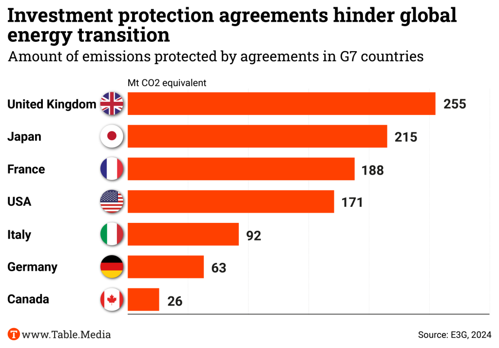 Globally, investment treaties protect fossil fuel assets that together can emit up to around two gigatons (Gt) of CO₂ equivalent (CO₂e) per year. Parent companies based in the G7 are responsible for 50 percent of the total volume. Their share corresponds to over 40 percent of the G7’s greenhouse gas emissions from electricity generation in 2022.