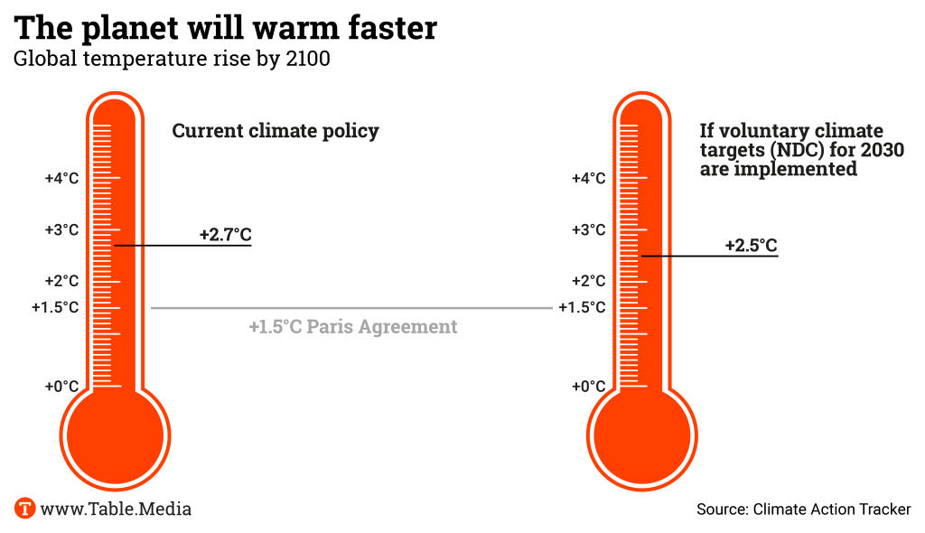 If the actual climate policy of all countries is taken as the basis for the forecast instead of the climate targets, this even results in global warming of 2.7 degrees by 2100. This is the same result as two years ago. Back then, governments agreed to tighten their climate targets at COP26 in Glasgow.