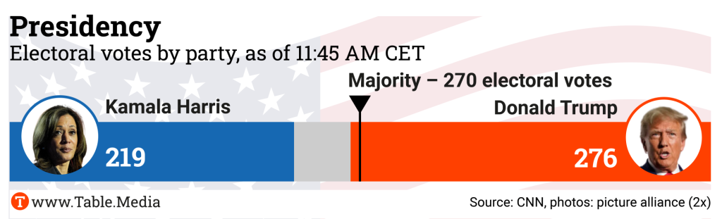 In Washington, D.C., there’s an atmosphere of defeat among Democrats, while Republicans are celebrating in Palm Beach. At 2:30 a.m. Eastern Time (8:30 a.m. German time), Donald Trump addressed his supporters in his home state of Florida. Surrounded by family and supporters, Trump declared victory after CNN called the critical swing state of Pennsylvania in his favor. His long-time ally, Fox News, had already announced him as the victor.