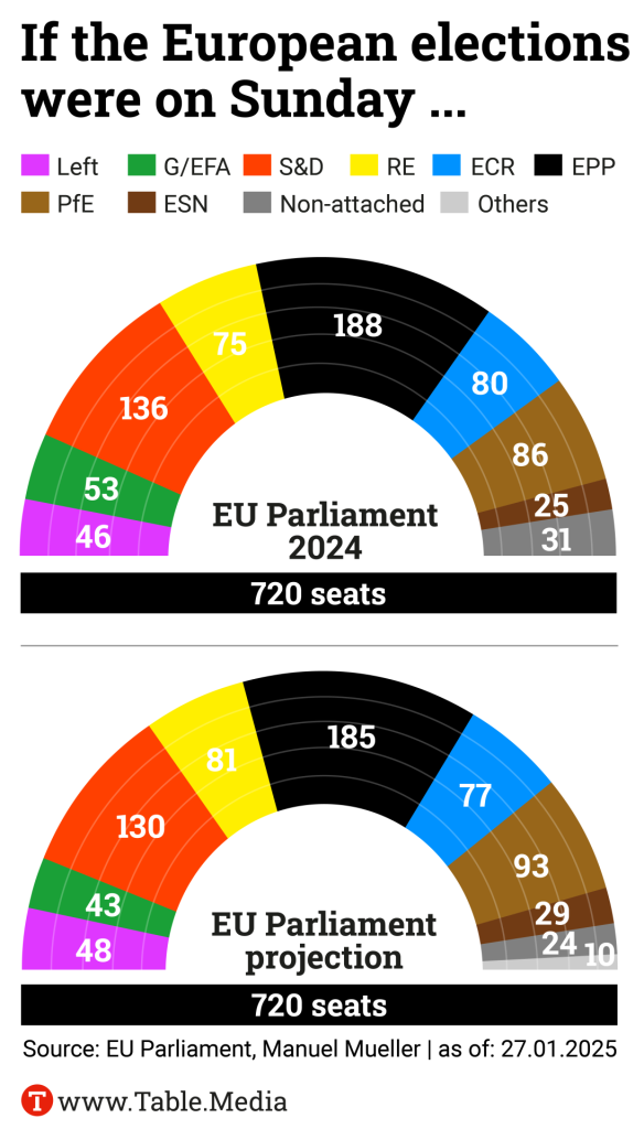 The three parliamentary groups of the grand coalition “platform”, on the other hand, are all experiencing slight losses. In the case of the European People’s Party (EPP), this is due in particular to Germany, where the CDU/CSU, although clearly leading in the Bundestag election campaign, has been gradually losing support for several weeks. (Most of the polls included in the seat projection were conducted before Friedrich Merz’s latest asylum policy initiative).