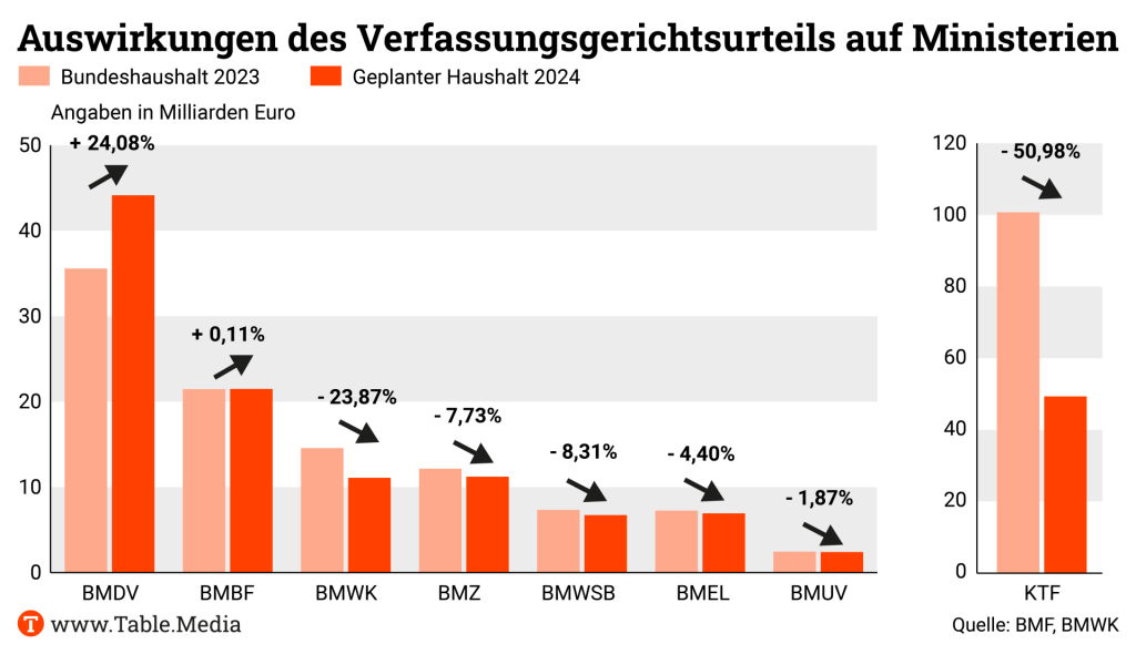 Das Bundesministerium für Wirtschaft und Klimaschutz, bislang zentraler Schrittmacher der Transformation hin zur Klimaneutralität, ist mit am stärksten von Kürzungen betroffen. Im Vergleich zum Haushalt 2023 sinken die Ausgaben um fast 3,5 Milliarden Euro. Hinzu kommen die Kürzungen im KTF, der nach dem Urteil des Bundesverfassungsgerichts um 50 Milliarden Euro zusammengestrichen wird – wobei die meisten der gestrichenen Ausgaben dieses Fonds allerdings über mehrere Jahre geplant waren.