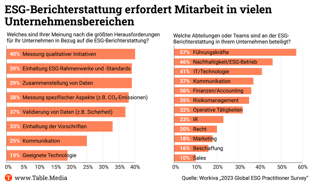 Der von der US-Softwarefirma Workiva Inc. durchgeführte Global ESG Practitioner Survey 2023 vermittelt einen Eindruck davon, wie viel Arbeit Unternehmen in die Erfüllung der ESG-Berichtpflichten investieren. Befragt wurden im Juli 926 Mitarbeiter, die mit ESG-Berichterstattung vertraut sind, aus der Führungsriege, dem Finanz- und Rechnungswesen, ESG-Operationen, Innenrevision und Risikomanagement sowie Recht. Sie stammen aus Firmen mit einem Umsatz von mindestens 250 Millionen US-Dollar und kommen aus neun Märkten, darunter den USA, Großbritannien, Deutschland sowie Frankreich.