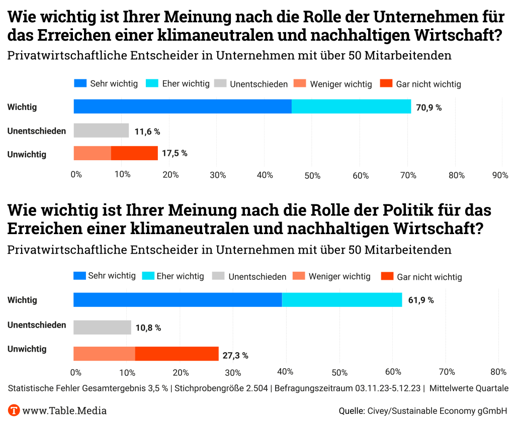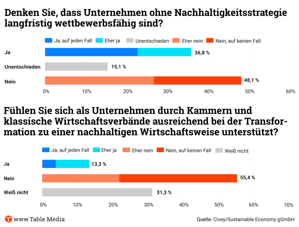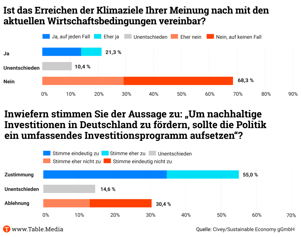 Wir stellen Ihnen die Ergebnisse der Umfrage, die uns exklusiv vorliegt, ausführlich vor – beauftragt wurde sie von den Organisatoren des Sustainable Economy Summit, der noch bis Mittwoch in Berlin tagt. Table.Media ist Medienpartner der Veranstaltung.