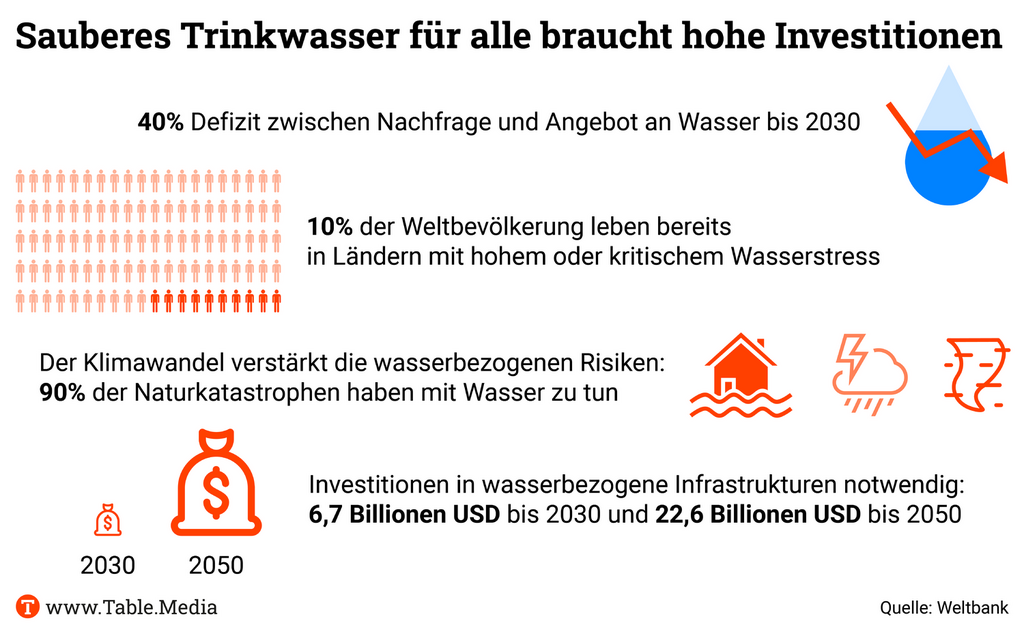 Bei der Einhaltung der planetaren Grenzen spielt Wasser eine wichtige Rolle. Die Entwicklungen sind alarmierend. Mehr als 2,3 Milliarden Menschen fehlt Zugang zu sauberem Trinkwasser, hieß es kürzlich bei der Weltbank. Es sei dringend notwendig, “dieser kostbaren Ressource Vorrang einzuräumen, sie zu schützen und den nachhaltigen Zugang zu verschiedenen Wasserdienstleistungen für Gemeinschaften und Volkswirtschaften zu sichern”. Dafür braucht es gewaltige Investitionen in die Wasserinfrastruktur. Gut eine Billion Dollar pro Jahr wären laut OECD nötig. Alleine in der EU müssten bis 2030 jährlich fast 300 Milliarden Euro investiert werden. Dreimal so viel, wie derzeit an Geld in Wasserprojekte fließt. Es muss also etwas passieren in der Realwirtschaft genauso wie am Finanzmarkt.