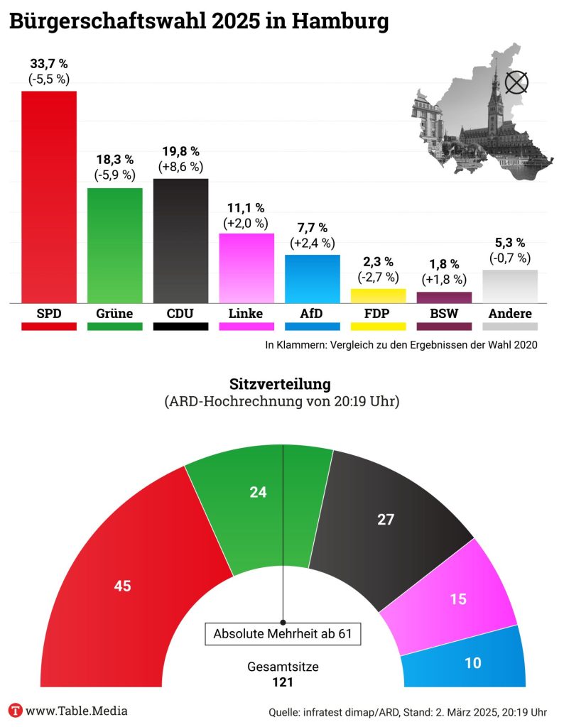 Bürgerschaftswahl in Hamburg: Tschentscher kann sich Partner aussuchen. Eine Woche nach ihrer schweren Niederlage bei der Bundestagswahl kann die SPD in Hamburg einen kleinen Erfolg verbuchen. Hochrechnungen zufolge reicht es für die Sozialdemokraten von Bürgermeister Peter Tschentscher, um die Koalition mit den Grünen fortzuführen. Der zweite Platz für die CDU macht aber auch eine große Koalition möglich. Damit sind die Mehrheitsverhältnisse in Hamburg nicht so festgefahren wie im Bund. CDU-Spitzenkandidat Dennis Thering pochte bereits auf eine Zusammenarbeit mit der SPD und bot am Abend “ein pragmatischeres Regieren an, als die Grünen das zuletzt gemacht haben”.