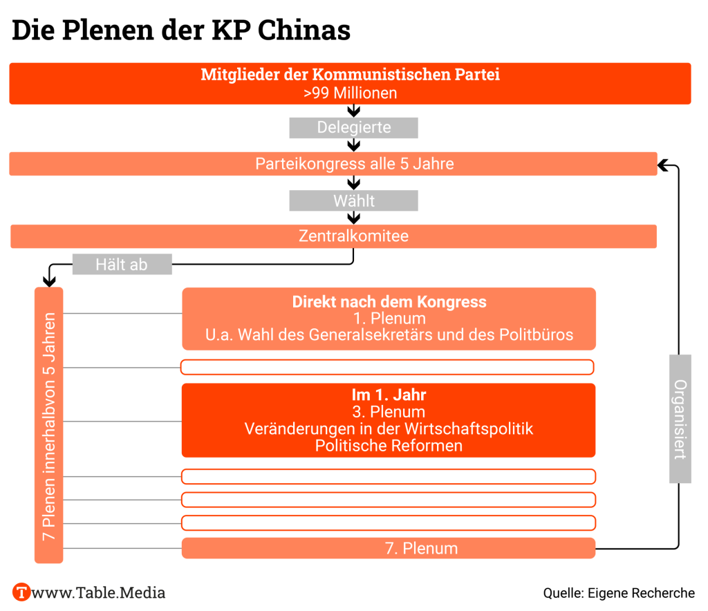 Die KP hat mitgeteilt, dass das Dritte Plenum am 15. Juli beginnen soll. Ein Plenum ist in der Sprache der Partei ein Treffen aller Mitglieder des Zentralkomitees. Derzeit hat das 20. Zentralkomitee seit Parteigründung mit seinen 367 Mitgliedern das Sagen. Bisherige Äußerungen aus der KP weisen darauf hin, dass wieder einmal eine “Vertiefung umfassender Reformen zur Förderung der chinesischen Modernisierung” beschlossen werden soll.