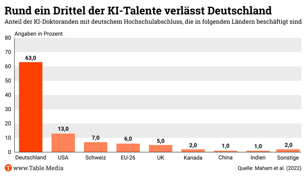 Die Rahmenbedingungen sind also entscheidend, weniger die Einzel-Förderung von Forschung und Transfer. “Der Staat soll in Ökosysteme investieren, in Cluster, wo sich Wissenschaft, Wirtschaft und Verwaltung vernetzen.” Allerdings falle das schwer, wenn es in Deutschland kaum KI-Forschungs-Cluster gebe, die weltweit konkurrenzfähig sind. Neben den wenigen exzellenten Forschungshotspots wie München und Tübingen, brauche es mehr anwendungsorientierte Zentren für das Thema, vor allem in der Verknüpfung von KI mit der Industrie und mittelständischen Geschäftsmodellen. “Hier liegt Deutschlands Chance.”