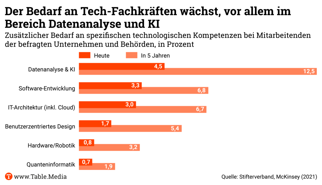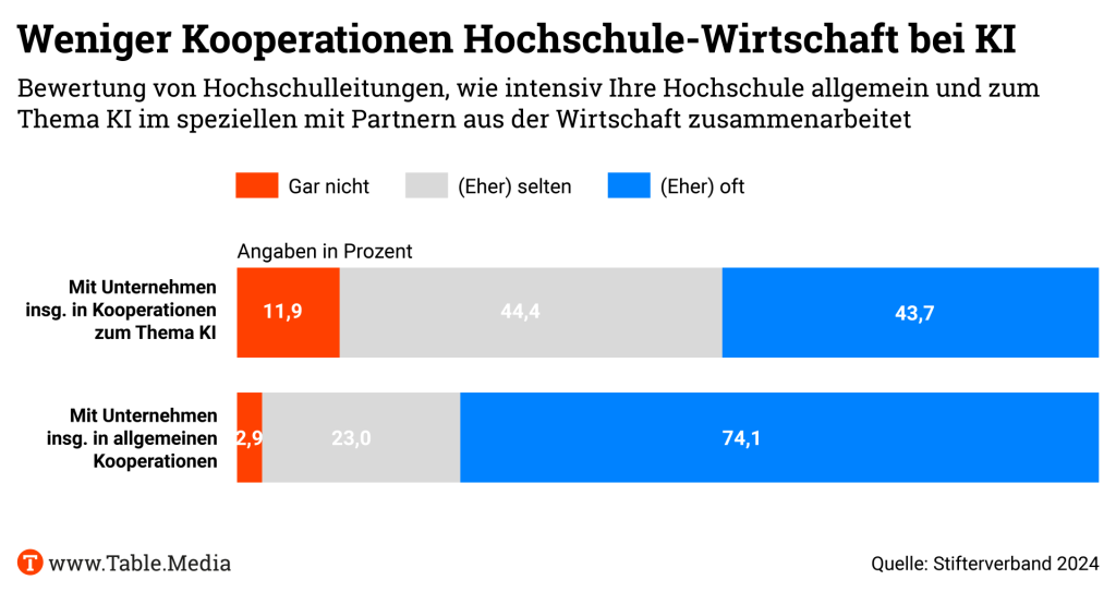 Aber auch die jungen Unternehmen und ihre Kunden haben noch Hausaufgaben zu machen. Es brauche eine größere Sensibilisierung für das wirtschaftliche Potenzial von KI. “Hier fehlt es noch an Bewusstsein für das, was möglich ist.” In den Weiterbildungsangeboten der Hochschulen und den Kooperationen zwischen Hochschulen und Unternehmen könnte man KI in den Mittelpunkt stellen. Dort spiele sie noch eine zu kleine Rolle. “Im KI-Bereich gibt es weniger Kooperationen zwischen Hochschulen und Unternehmen als bei anderen Themen, das zeigt unser Hochschulbarometer.”