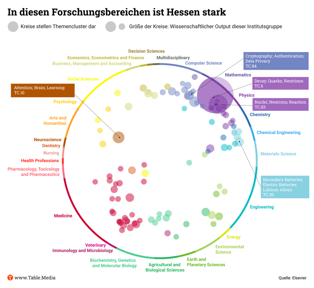 Eine Auswertung von Elsevier für den Table.Media-Länder-Kompass zeigt, in welchen Bereichen Hessen stark vertreten ist. Zu erkennen ist ein Schwerpunkt in der Forschung zu Cybersicherheit und Kryptografie. Auch im Bereich der Schwerionenforschung ist Hessen stark vertreten, wohl vor allem durch das gleichnamige Helmholtzzentrum. Zudem gibt es größere Cluster im Bereich der Batterie- und der Hirnforschung.