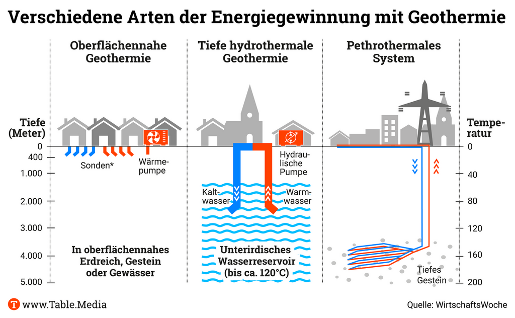Die bisher klar dominierenden Erneuerbaren im Wärmemarkt – Holz und Biomasse – lassen sich nur bedingt ausbauen. Die Nutzung von Umweltwärme und insbesondere Geothermie muss daher forciert werden. Neben der oberflächennahen Geothermie – sie ist per Definition auf Bohrtiefen bis 400 Meter begrenzt und in der Regel an Einfamilienhäusern zu finden -, ist vor allem die Tiefe Geothermie gefragt. Hier werden Schichten bis 5000 Meter erschlossen, wo die Temperaturen teils deutlich über 100 Grad Celsius liegen. Das erhöht die Effizienz von Anlagen und deren Output, sodass ganze Stadtviertel über ein Fernwärmenetz versorgt werden können.