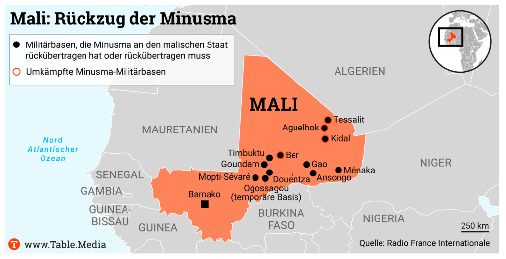 Der letzte deutsche Soldat soll Mali schon Mitte Dezember verlassen, zwei Wochen bevor das Mandat für die UN-Stabilisierungsmission in Mali (Minusma) endet. Das erfuhr Table.Media aus dem Umfeld der Minusma-Mission. Derzeit sind noch knapp 400 Bundeswehrsoldaten in Mali stationiert, die meisten am Stützpunkt Gao. Dort erhielten sie am Mittwoch Besuch von Generalinspekteur Carsten Breuer. Die Soldaten müssen das Äquivalent von 1.000 Containern nach Deutschland schaffen, davon seien rund 80 Prozent bereits verlegt worden, teilte das Verteidigungsministerium gestern mit. Weitere 500 Container-Äquivalente, in denen die Bundeswehr die Masse an Material berechnet, müssen wegen des Zeitdrucks zerstört werden.